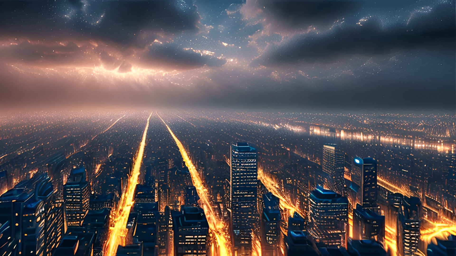 From the crow's nest of the tallest skyscraper, the Serenity Tower, the scene unfolds: intricate streets, illuminated by a myriad of distant embers, crisscross into an intricate pattern beneath you. The inky depths of the maze-like city core merge seamlessly with the celestial blanket above.