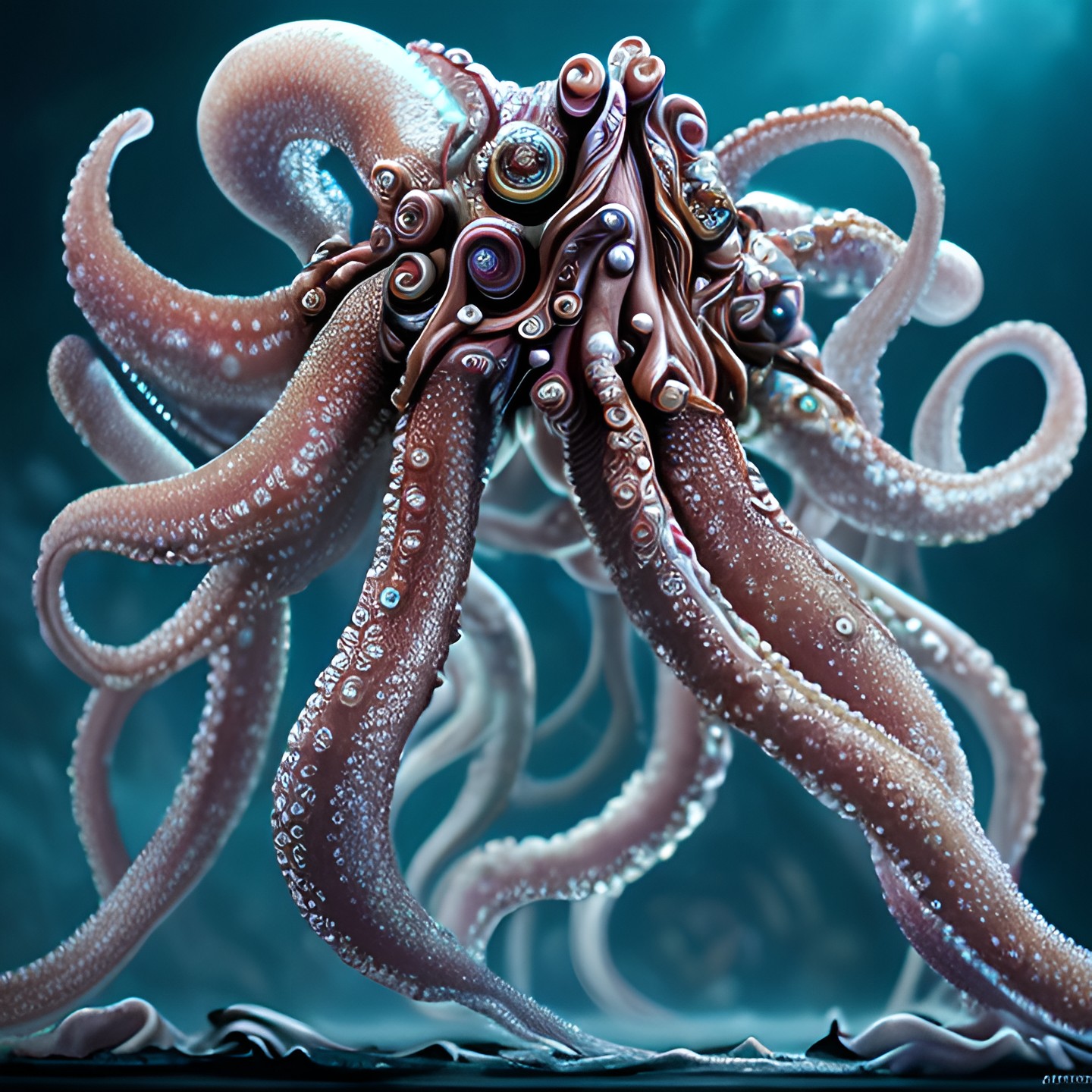 Prompt: award winning photo of a giant mesmerizing whimsical ctulhu squid creature, intricate realistic details