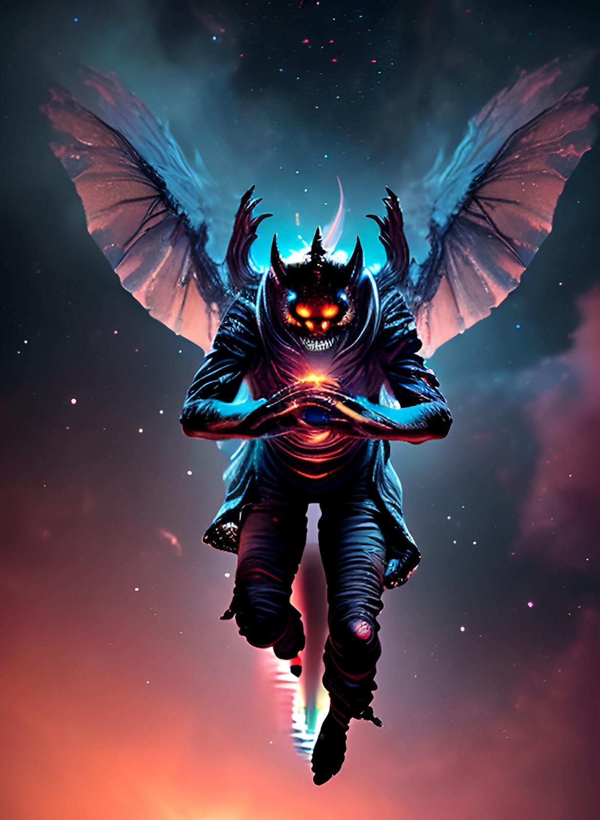 Prompt: a creepy demon flying in space, beautiful nebulae