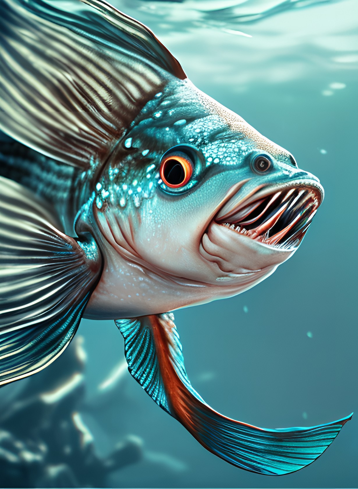 Prompt: photo of a dangerous creepy fish swimming in the sea, realistic, award winning shot, reflections, intricate details